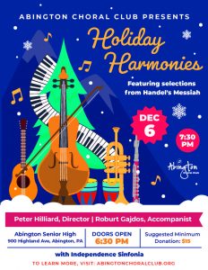 Abington Choral Club is thrilled to present Holiday Harmonies which will take place on Saturday, December 6, 2025 at 7:30 p.m.at Abington Senior High School, 900 Highland Avenue, Abington, PA.